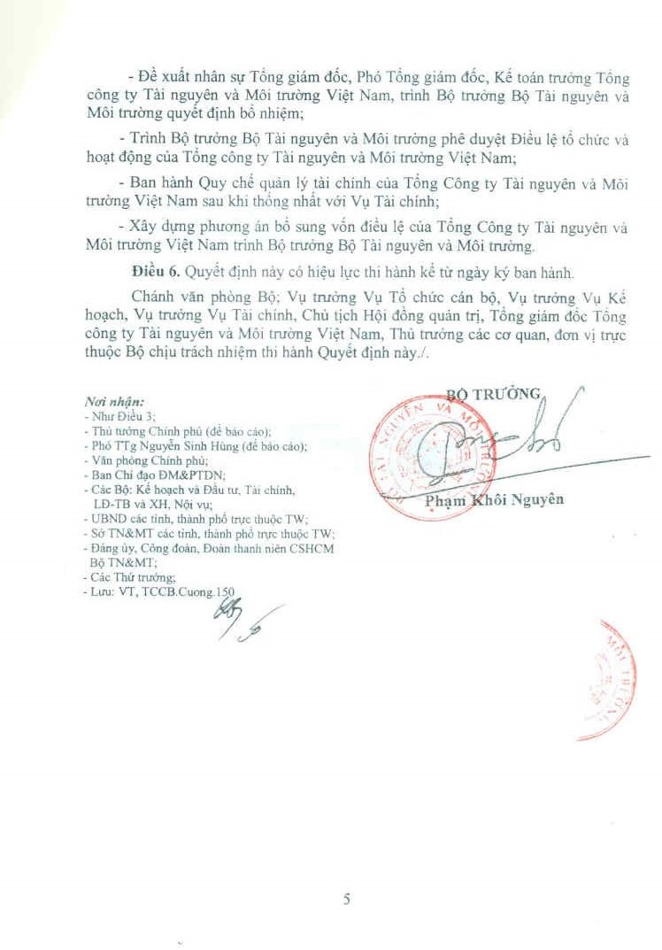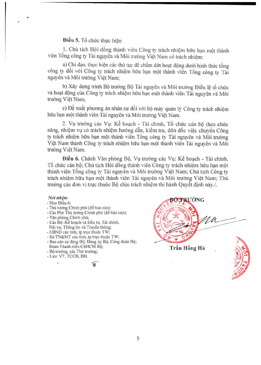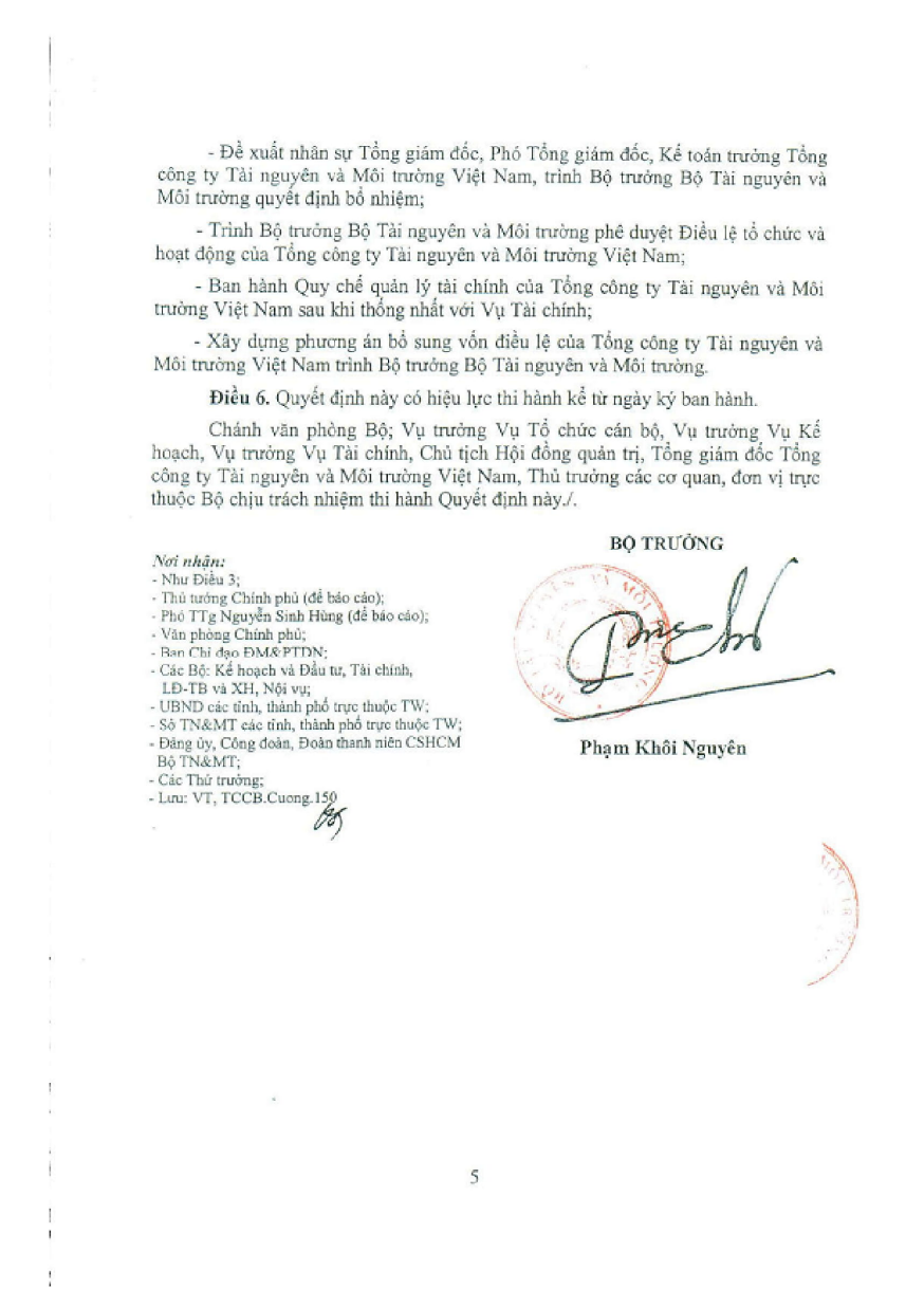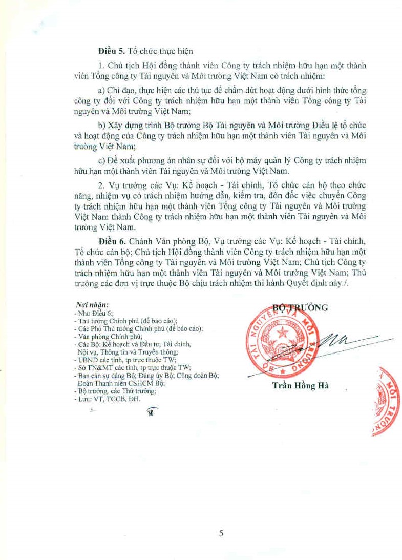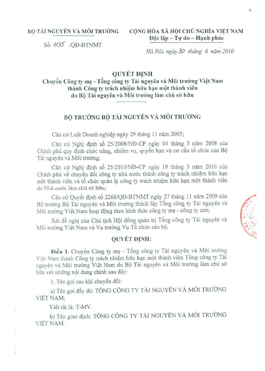 5. QUYẾT ĐỊNH CHUYỂN CÔNG TY MẸ - TỔNG CÔNG TY TÀI NGUYÊN VÀ MÔI TRƯỜNG VIỆT NAM THÀNH CÔNG TY TRÁCH NHIỆM HỮU HẠN MỘT THÀNH VIÊN DO BỘ TÀI NGUYÊN VÀ MÔI TRƯỜNG LÀM CHỦ SỞ HỮU