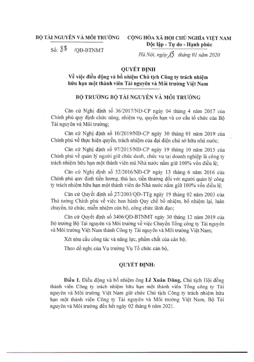 6. QUYẾT ĐỊNH V/V ĐIỀU ĐỘNG VÀ BỔ NHIỆM CHỦ TỊCH CÔNG TY TRÁCH NHIỆM HỮU HẠN MỘT THÀNH VIÊN TÀI NGUYÊN VÀ MÔI TRƯỜNG VIỆT NAM