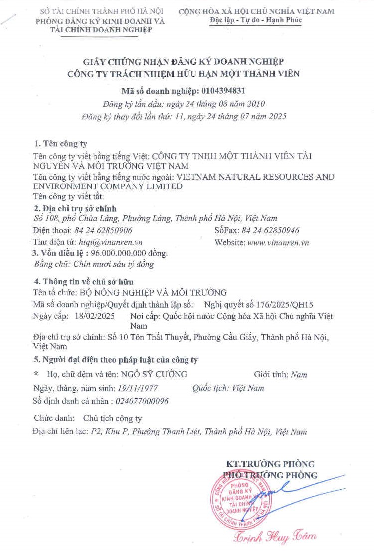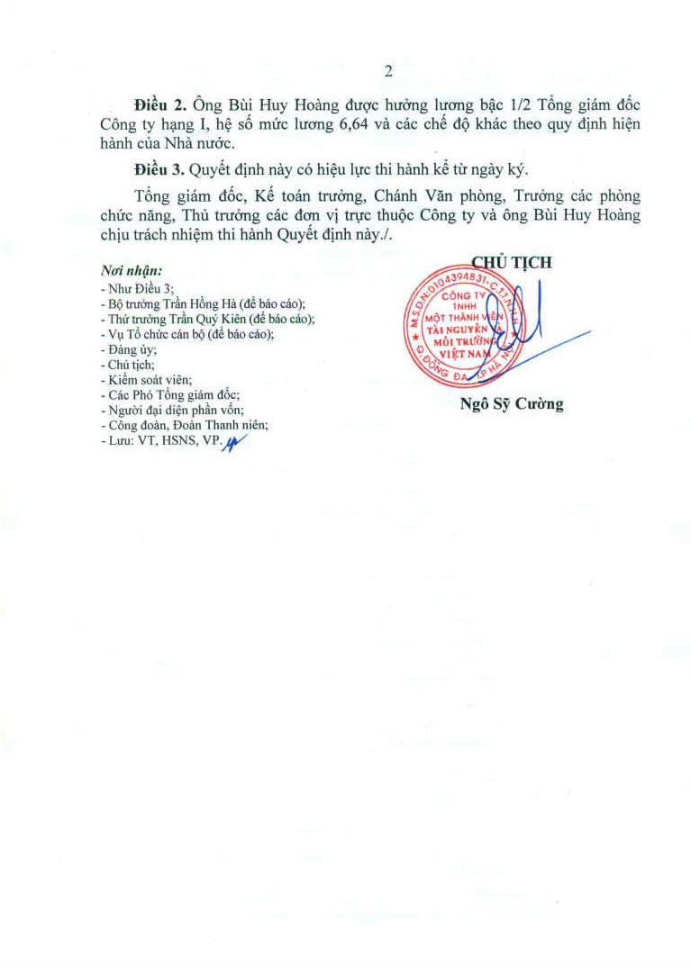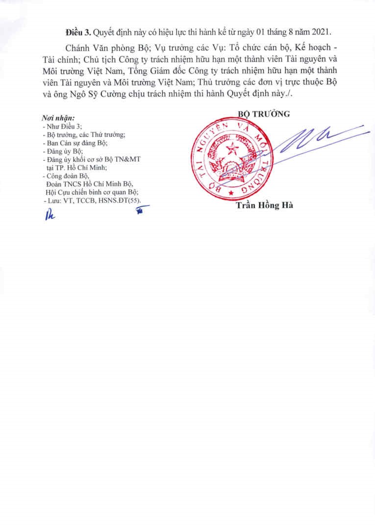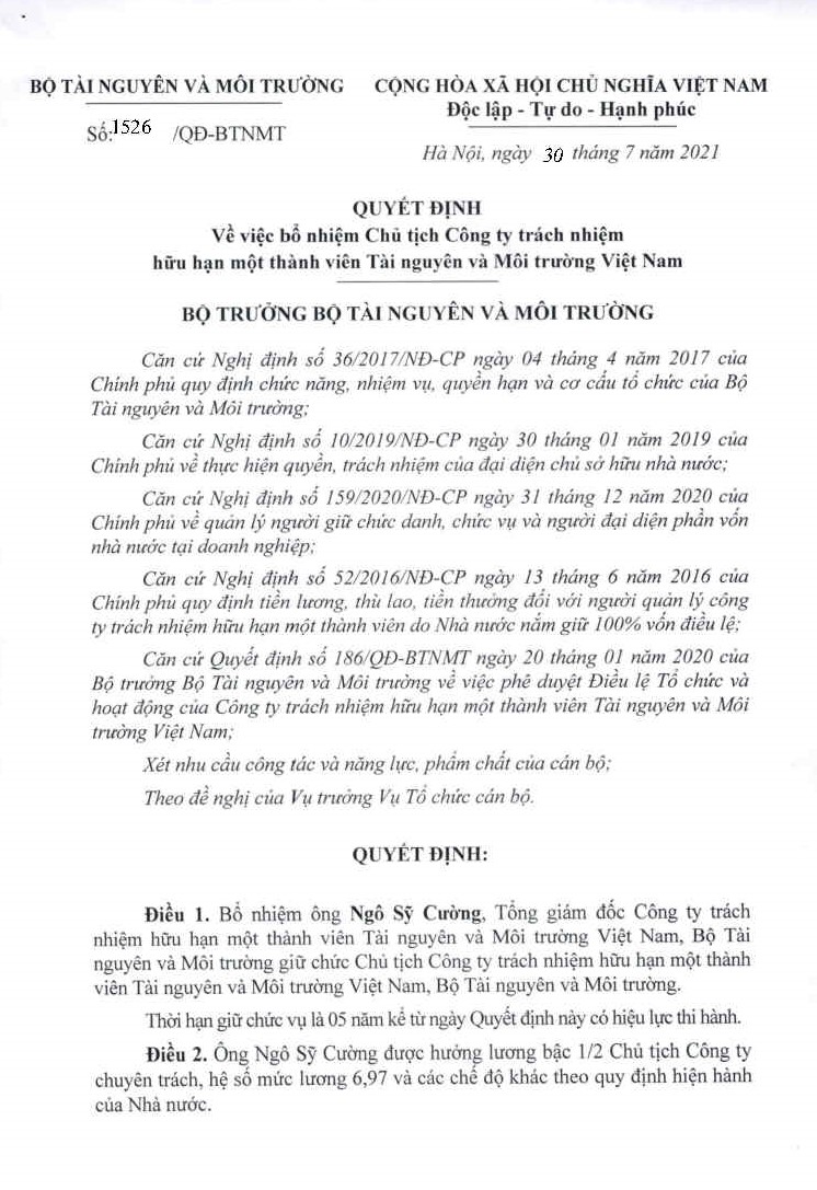 6. QUYẾT ĐỊNH BỔ NHIỆM CHỦ TỊCH CÔNG TY TRÁCH NHIỆM HỮU HẠN MỘT THÀNH VIÊN TÀI NGUYÊN VÀ MÔI TRƯỜNG VIỆT NAM